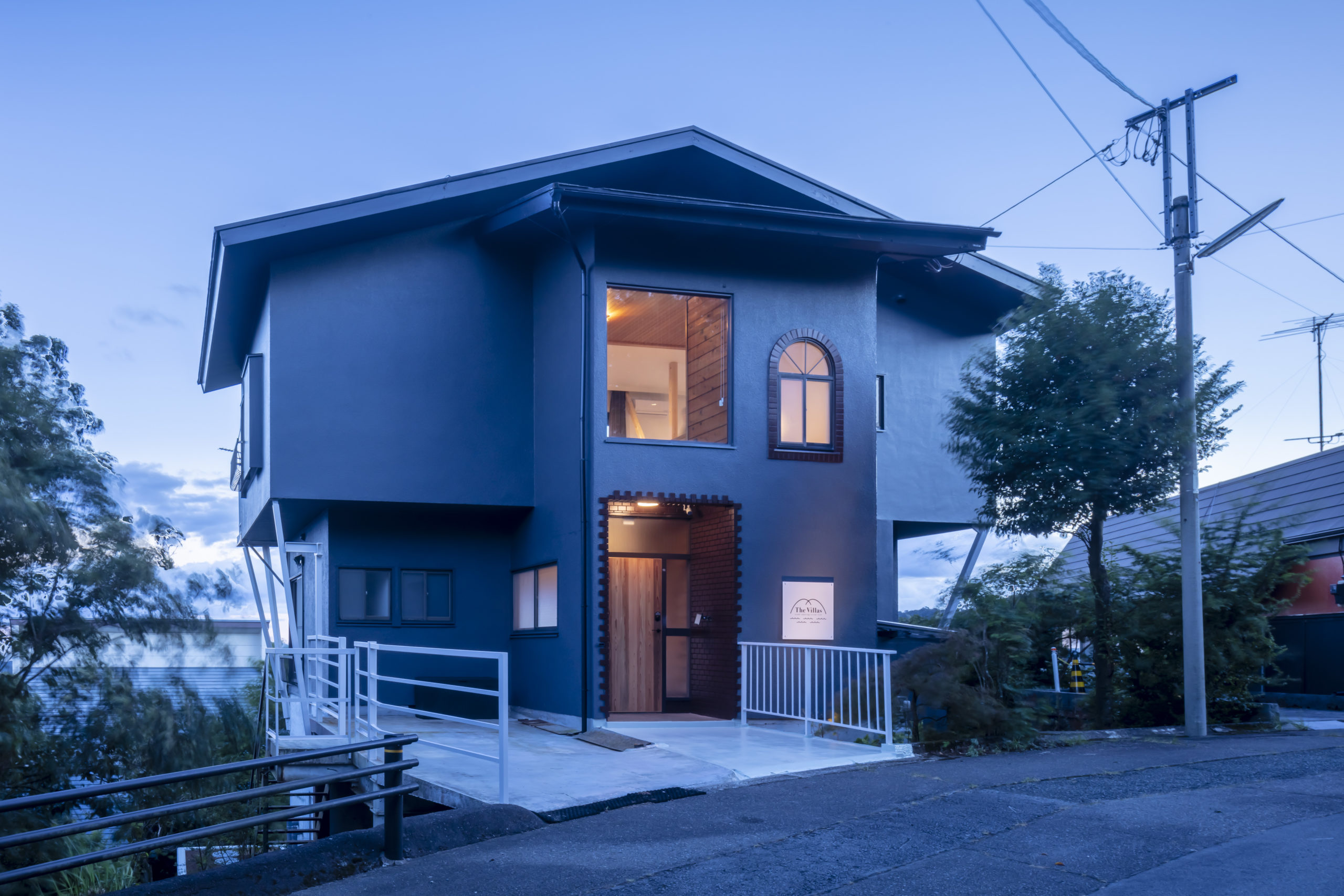 外観は周囲の自然に溶け込む落ち着いた色調でまとめられ、山の稜線とエレガントなフォントを組み合わせた看板が、この場所の特別性を静かに印象づけます。